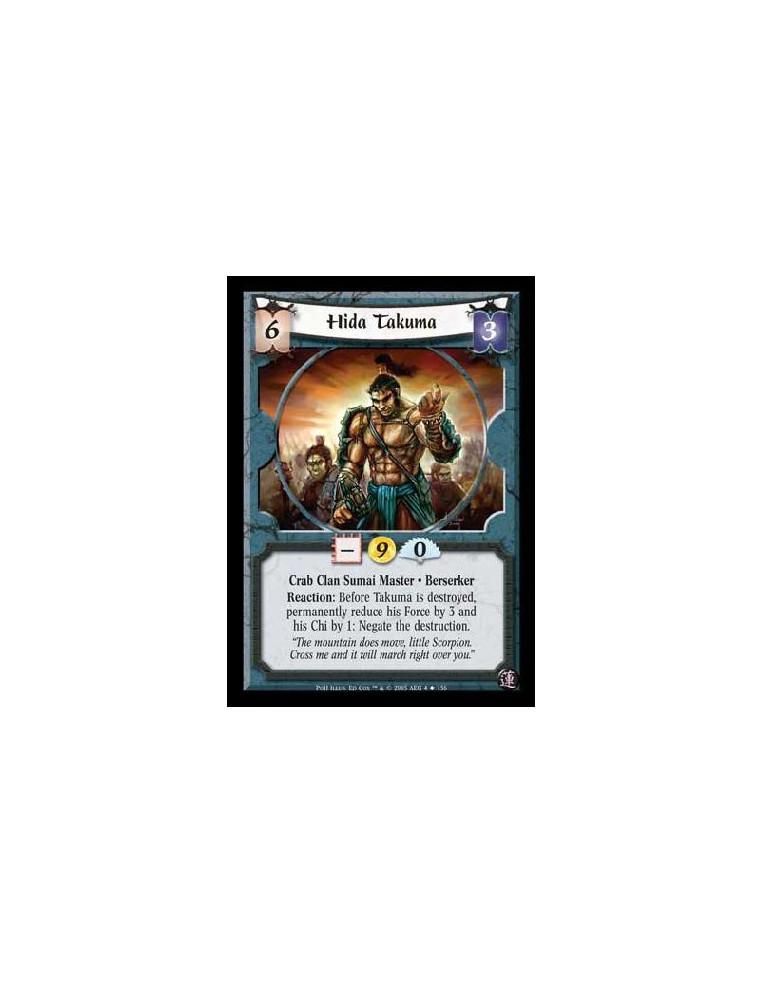 Crab Clan Sumai Master · Berserker. Reaction: Before Takuma is destroyed, permanently reduce his Force by 3 and his Chi by 1: Negate the destruction
