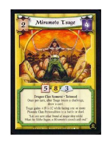 Mirumoto Tsuge  - Dragon Clan Samurai * Tattooed Tsuge gains +1F/+1C while opposing one or more Phoenix Clan Personalities in a
