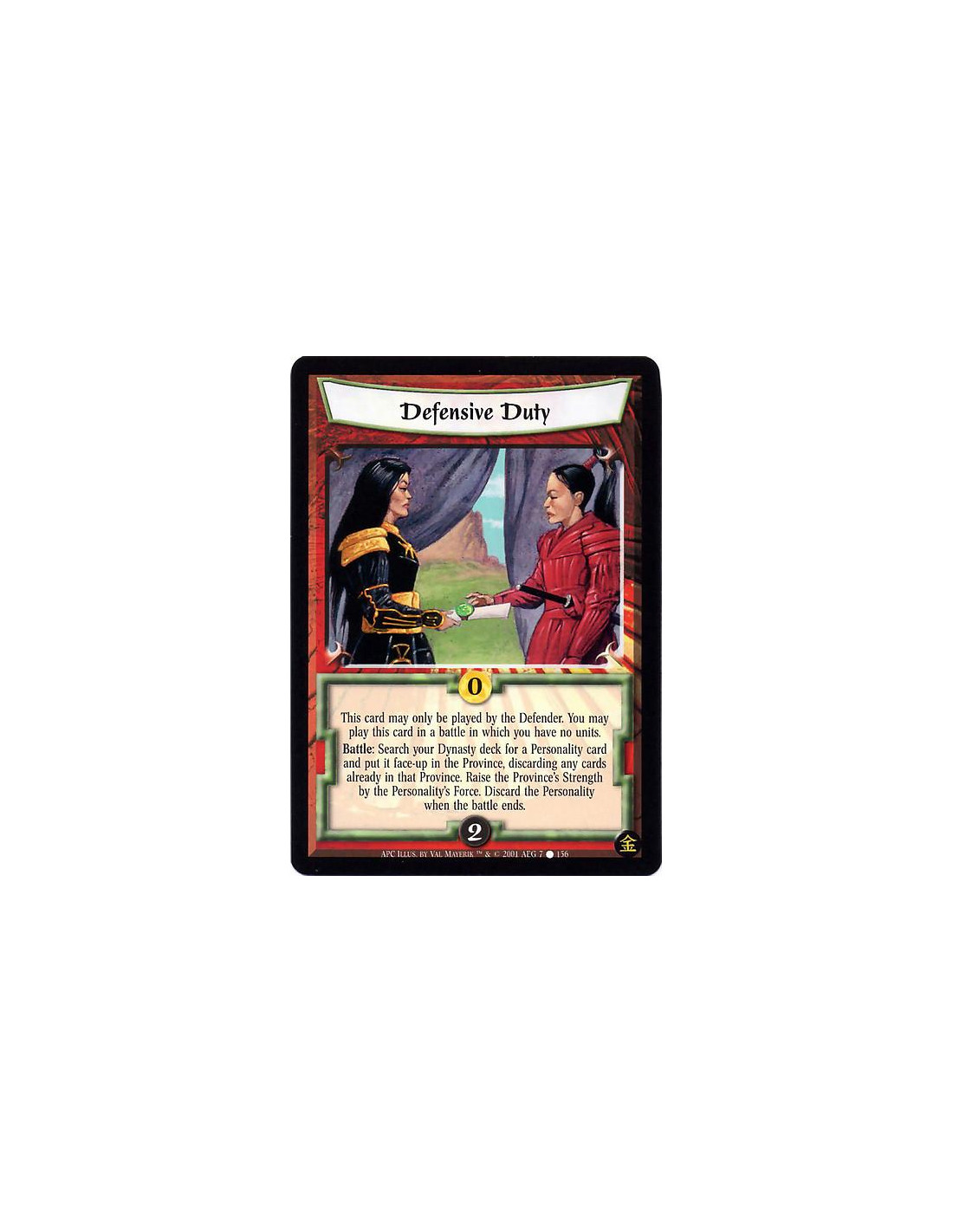 This cards may only be played by the Defender. You may play this card in a battle in which you have no units. Battle : Search your Dynasty deck for a Personality card and put it face up in the Province, discarding any cards already in that Province. Raise the Province's Strength by the Personality's Force. Discard the Personality when the battle ends.