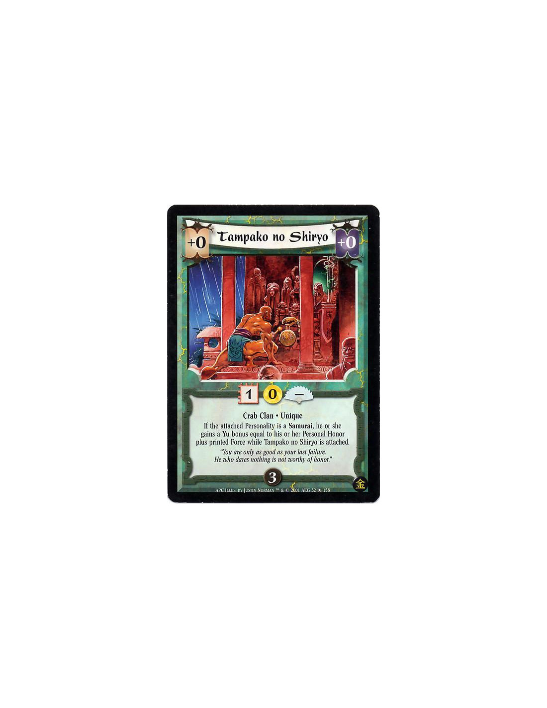 Crab Clan. Unique If the attached personality is a Samurai, he or she gains a Yu bonus equal to his or her Personal Honor plus printed Force while Tampako no Shiryo is attached.