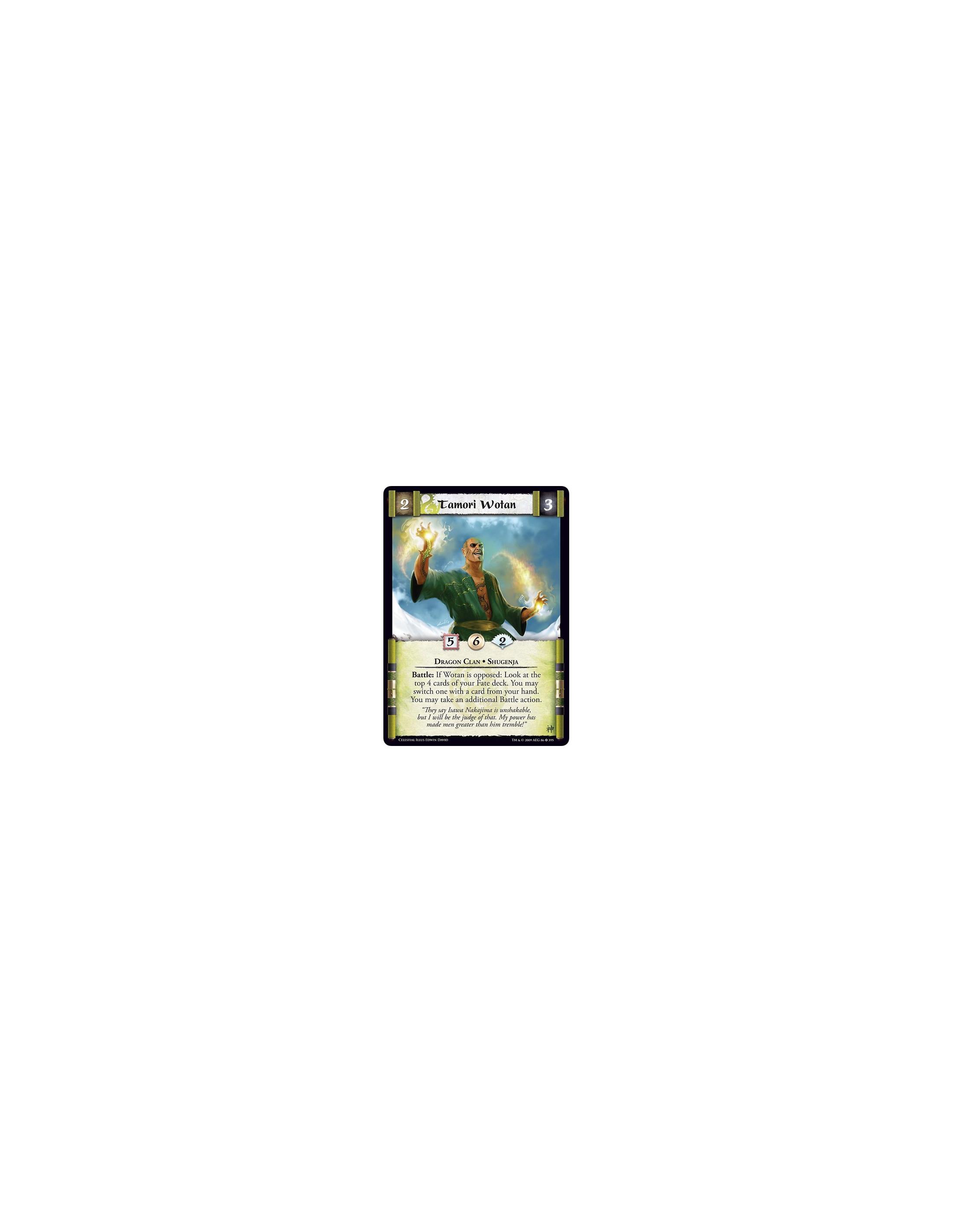 Tamori Wotan (Español)  - Dragon Clan • Shugenja Battle: If Wotan is opposed: Look at the top 4 cards of your Fate deck. You may