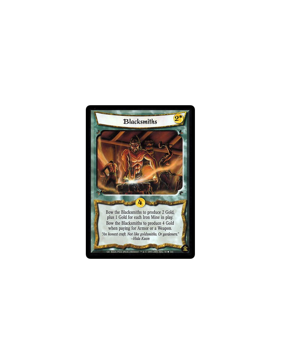 Bow Blacksmiths to produce 2 Gold, plus 1 Gold for every Iron Mine in play. Bow Blacksmiths to produce 4 Gold when paying for a Weapon or Armor.