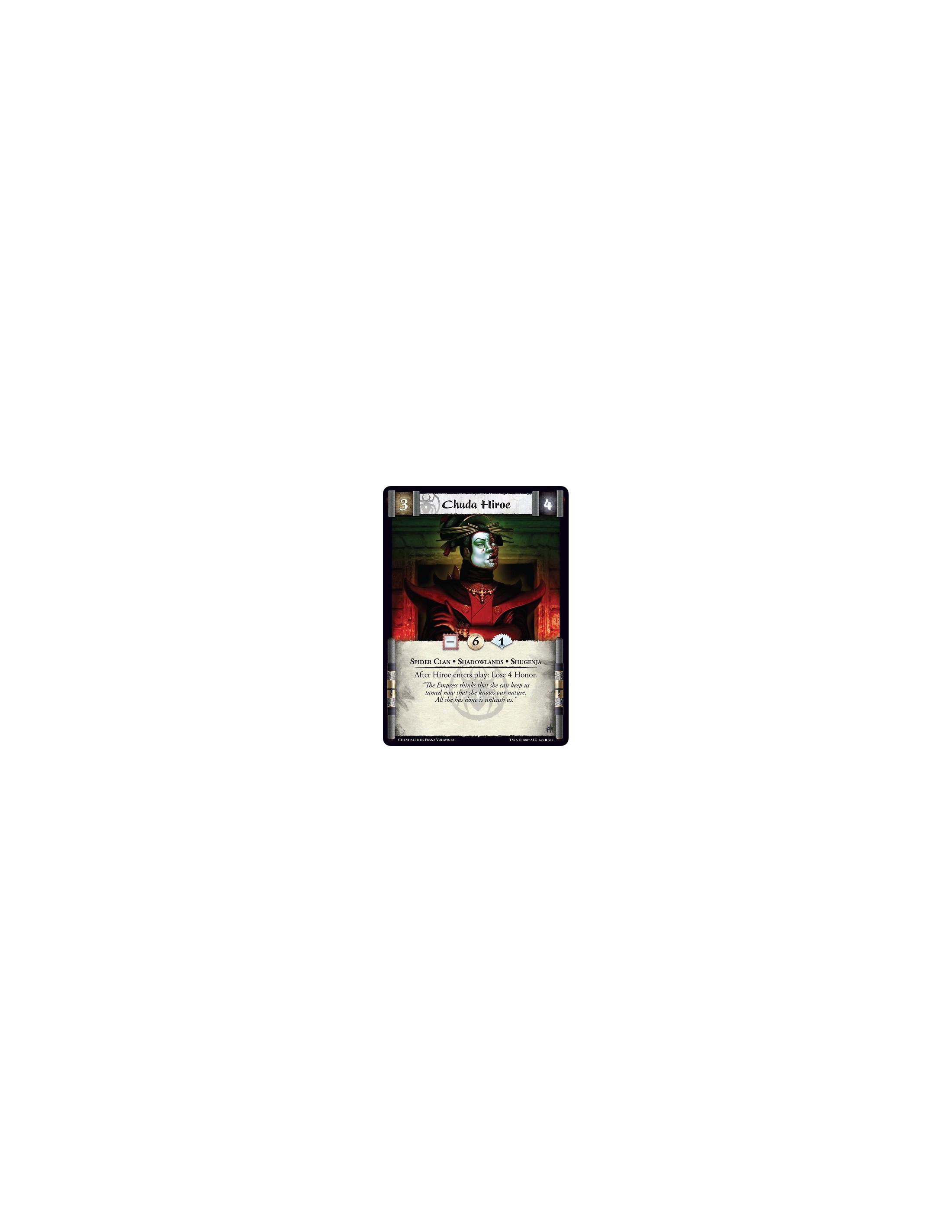Shadowlands • Unique After this card enters play: Lose 5 Honor. After battle resolution destroys an army, if this card is in the current winning army: Give it a +1F token for each unit in that army that was destroyed. Fear Battle: Fear 2. Limited: Once per game, destroy any player's target Hida Sukune, who performs this action if he is yours: Give...