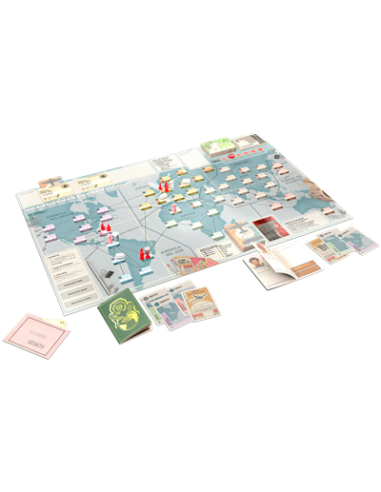 1 tablero, 4 Pasaportes, 4 Peones, 9 Miniaturas de equipo, 8 Pisos francos, 36 figuras de Agente, 35 Indicadores, 3 hojas de Adhesivos, 2 Carpetas, 4 hojas de Referencia, 134 cartas Legacy, 151 cartas adicionales, 3 Dosieres, 8 Depósitos de seguridad, 1 reglamento, 1 Memoria de la misión ¡y mucho más!.