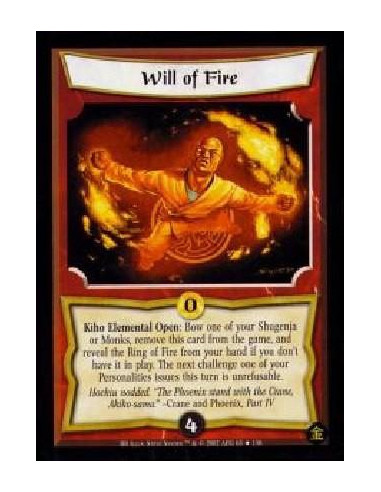Kiho Elemental Open: Bow one of your Shugenja or Monks, remove this card from the game, and reveal the Ring of Fire from your hand if you don't have it in play. The next challenge one of your Personalities issues this turn is unrefusable.Hochiu nodded. ?The Phoenix stand with the Crane, Akiko-sama.? ?Crane and Phoenix, Part IV