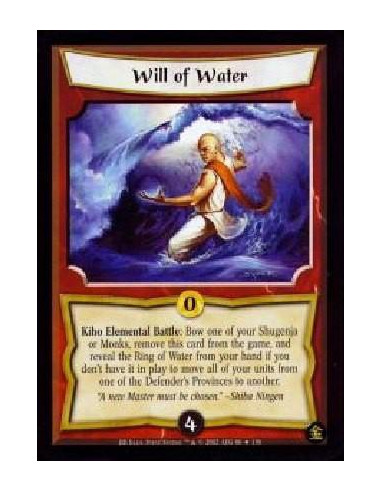 Kiho Elemental Battle: Bow one of your Shugenja or Monks, remove this card from the game, and reveal the Ring of Water from your hand if you don't have it in play to move all of your units from one of the Defender's Provinces to another.?A new Master must be chosen.? ?Shiba Ningen