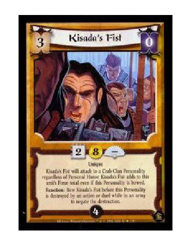 Unique Kisada's Fist will attach to a Crab Clan Personality regardless of Personal Honor. Kisada's Fist adds to this unit's Force total even if this Personality is bowed. Reaction: Bow Kisada's Fist before this Personality is destroyed by an action or duel while in an army to negate the destruction.
