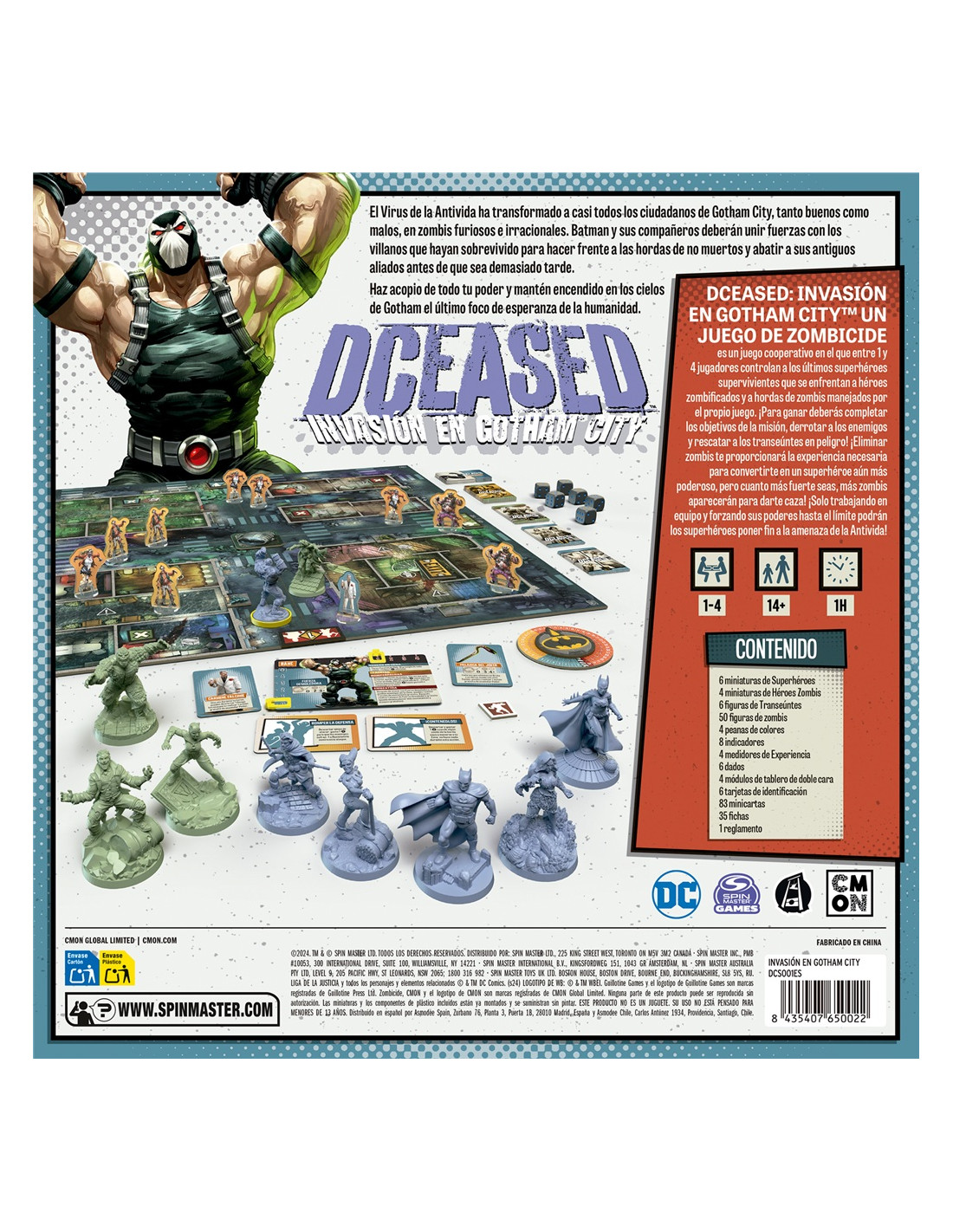 DCEASED: INVASIÓN EN GOTHAM CITY™ UN JUEGO DE ZOMBICIDE es un juego cooperativo en el que entre 1 y 4 jugadores controlan a los últimos superhéroes supervivientes que se enfrentan a héroes zombificados y a hordas de zombis manejados por el propio juego. ¡Para ganar deberás completar los objetivos de la misión, derrotar a los enemigos y rescatar a los transeúntes en peligro! ¡Eliminar zombis te proporcionará la experiencia necesaria para convertirte en un superhéroe aún más poderoso, pero cuanto más fuerte seas, más zombis aparecerán para darte caza! ¡Solo trabajando en equipo y forzando sus poderes hasta el límite podrán los superhéroes poner fin a la amenaza de la Antivida!