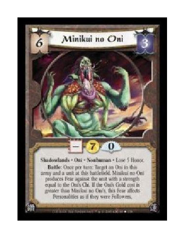 Shadowlands · Oni · Nonhuman · Lose 5 Honor. Battle: Once per turn: Target an Oni in this army and a unit at this battlefield. Minikui no Oni produces Fear against the unit with a strength equal to the Oni's Chi. If the Oni's Gold cost is greater than Minikui no Oni's, this Fear affects Personalities as if they were Followers