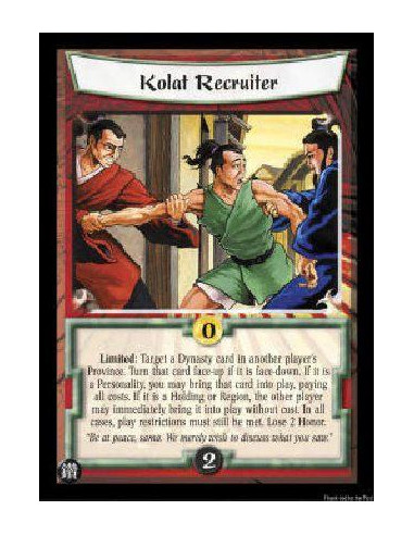 Kolat Recruiter  - Limited: Target a Dynasty card in another player's Province. Turn that card face-up if it is face-down. If it