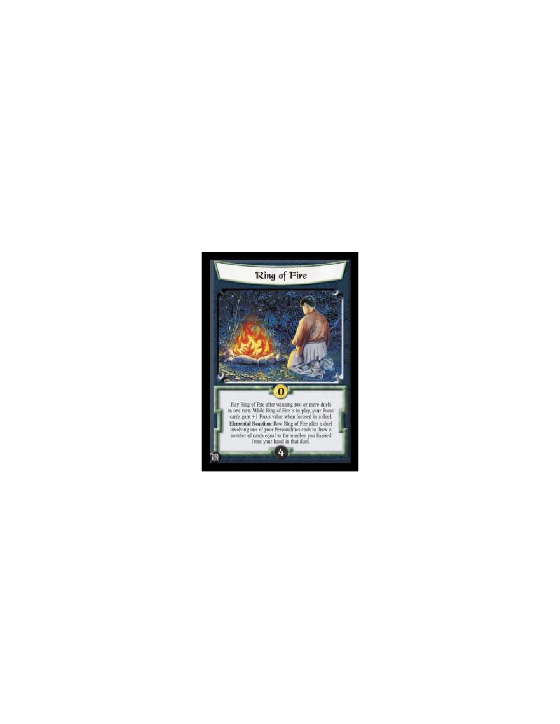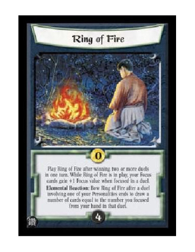 Play Ring of Fire after winning two or more duels in one turn. While Ring of Fire is in play, your Focus cards gain +1 Focus value when focused in a duel. Elemental Reaction: Bow Ring of Fire after a duel involving one of your Personalities ends to draw a number of cards equal to the number you focused from your hand in that duel.