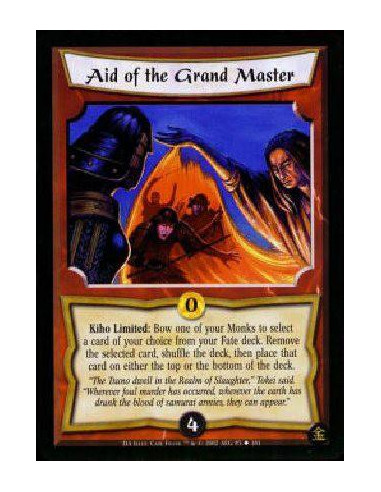 Aid of the Grand Master  - Kiho Limited: Bow one of your Monks to search your Fate deck for a card. Remove the card, shuffle the