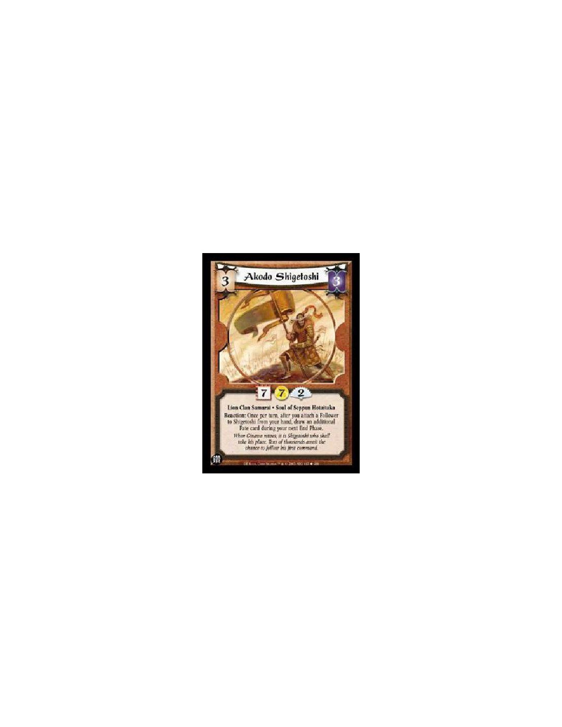 Lion Clan Samurai · Tactician · Unique · Soul of Ginawa Experienced 3. Battle: Target a face-up Human Personality in the current battle's Province. Bring him into play in your current army and under your control, ignoring costs and entering-play effects. Discard him to his owner's discard pile after the battle ends