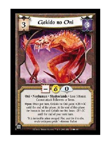 Oni * Nonhuman * Shadowlands * Lose 3 Honor. Cannot attach Followers or Items. Open: Once per turn, Gekido no Oni gains +2F/+3C until the end of the phase. At the end of this phase the bonus is lost and Gekido no Oni loses -2F/-2C until the end of your next turn.