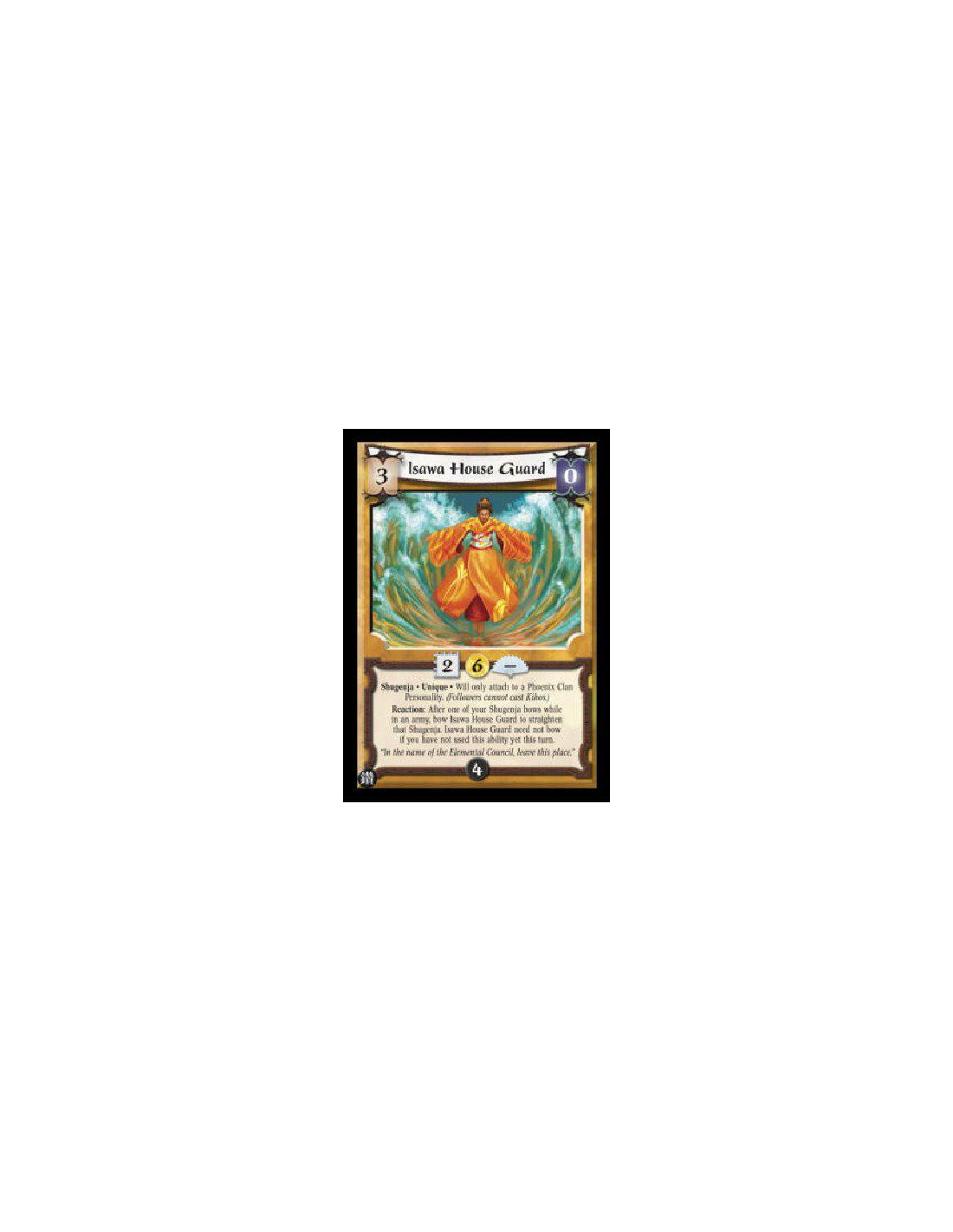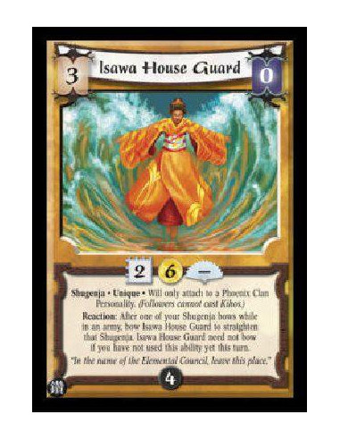 Shugenja * Unique * Will only attach to a Phoenix Clan Personality. (Followers cannot cast Kihos.) Reaction: After one of your Shugenja bows while in an army, bow Isawa House Guard to straighten that Shugenja. Isawa House Guard need not bow if you have not used this ability yet this turn.