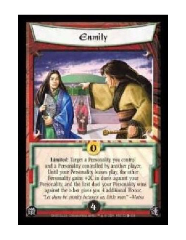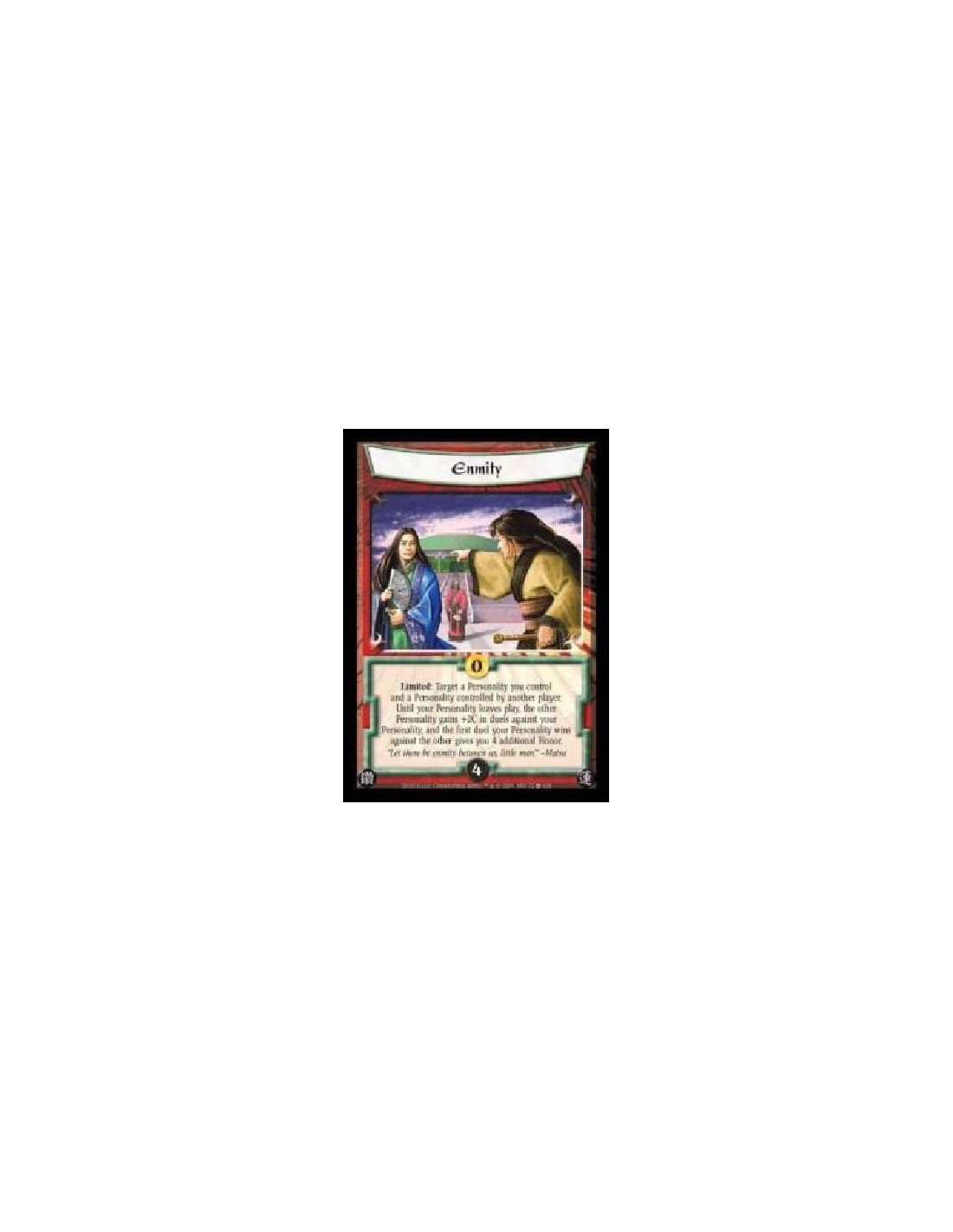 Limited: Target a Personality you control and a Personality controlled by another player. Until your Personality leaves play, the other Personality gains +2C in duels against your Personality, and the first duel your Personality wins against the other gives you 4 additional Honor.