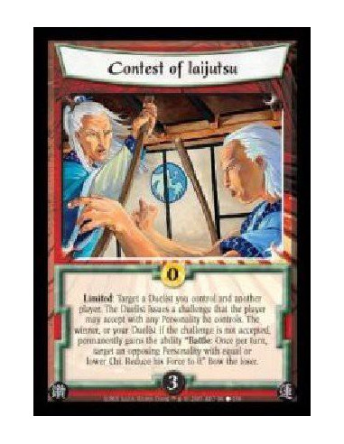 Crab Clan • Samurai • Siege • Siege Master Taru costs one less Gold to bring into play for each province destroyed this game. Battle: Discard a card: Abilities on a target enemy Personality may not be used during this battle. Draw a card.