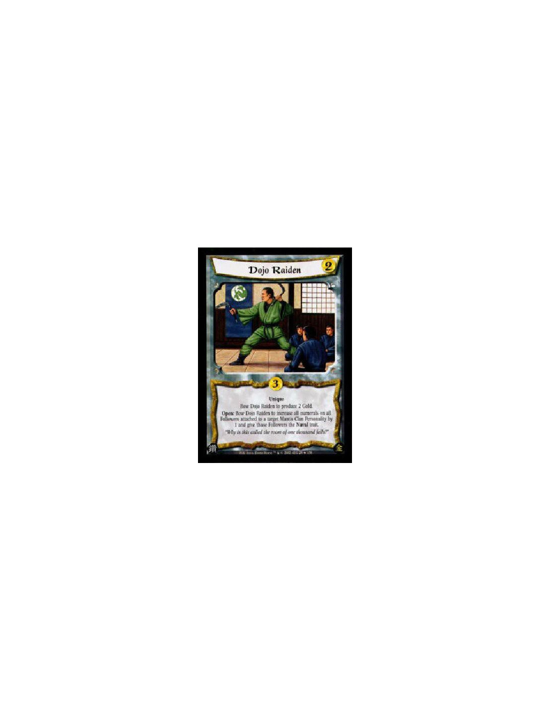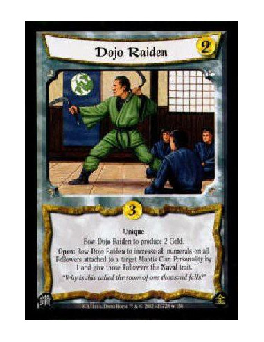 UniqueBow Dojo Raiden to produce 2 Gold.Open: Bow Dojo Raiden to increase all numerals on all Followers attached to a target Mantis Clan Personality by 1 and give those Followers the Naval trait.