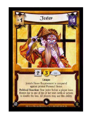UniqueJester's Honor Requirement is compared against printed Personal Honor.Political Reaction: Bow Jester before a player loses Honor due to one of his or her own cards or actions to double the loss. All players may use this ability.