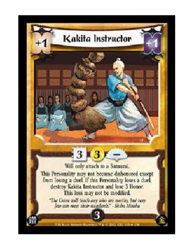 Will only attach to a Samurai. This Personality may not become dishonored except from losing a duel. If this Personality loses a duel, destroy Kakita Instructor and lose 3 Honor. This loss may not be modified.