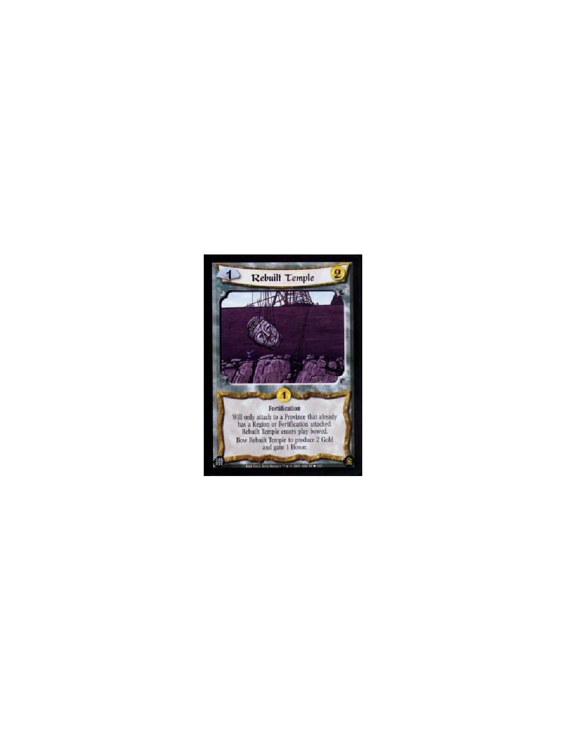 FortificationWill only attach to a Province that already has a Region or Fortification attached. Rebuilt Temple enters play bowed.Bow Rebuilt Temple to produce 2 Gold and gain 1 Honor.