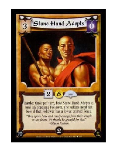 Battle: Once per turn, bow Stone Hand Adepts to bow an opposing Follower. The Adepts need not bow if that Follower has a lower printed Force.