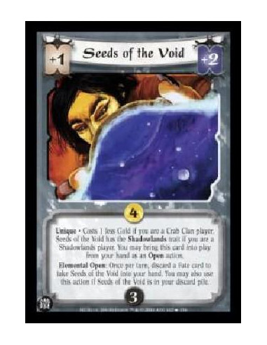Unique . Costs 1 less Gold if you are a Crab Clan player. Seeds of the Void has the Shadowlands trait if you are a Shadowlands player. You may bring this card into play from your hand as an Open action. Elemental Open: Once per turn, discard a Fate card to take Seeds of the Void into your hand. You may also use this action if Seeds of the Void is in your discard pile.