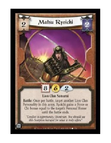 Matsu Ryoichi  - Lion Clan Samurai Battle: Once per battle, target another Lion Clan Personality in this army. Ryoichi gains a F
