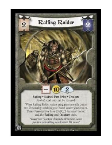 Ratling . Stained Paw Tribe . Creature Raider's cost may not be reduced. When Ratling Raiders enters play, permanently create two Personality cards in your home under your control. These Personalities have 2F/2C, 2 Personal Honor and the Ratling, and Creature traits.