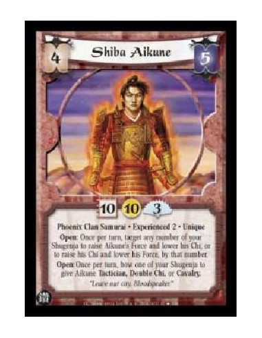Phoenix Clan Samurai . Experienced 2 . Unique Open: Once per turn, target any number of your Shugenja to raise Aikune's Force and lower his Chi, or to raise his Chi and lower his Force, by that number. Open: Once per turn, bow one of your Shugenja to give Aikune Tactician, Double Chi, or Cavalry.