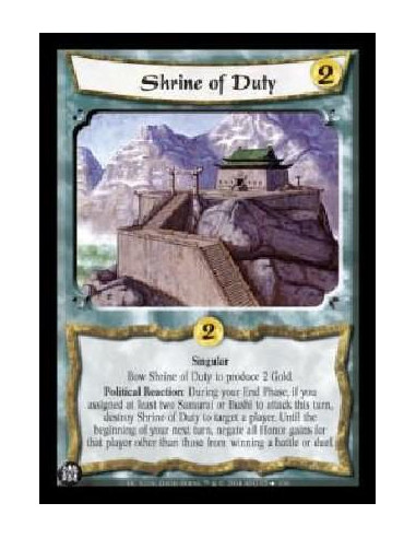 Singular Bow Shrine of Duty to produce 2 Gold. Political Reaction: During your End Phase, if you assigned at least two Samurai or Bushi to attack this turn, destroy Shrine of Duty to target a player. Until the beginning of your next turn, negate all Honor gains for that player other than those from winning a battle or duel.