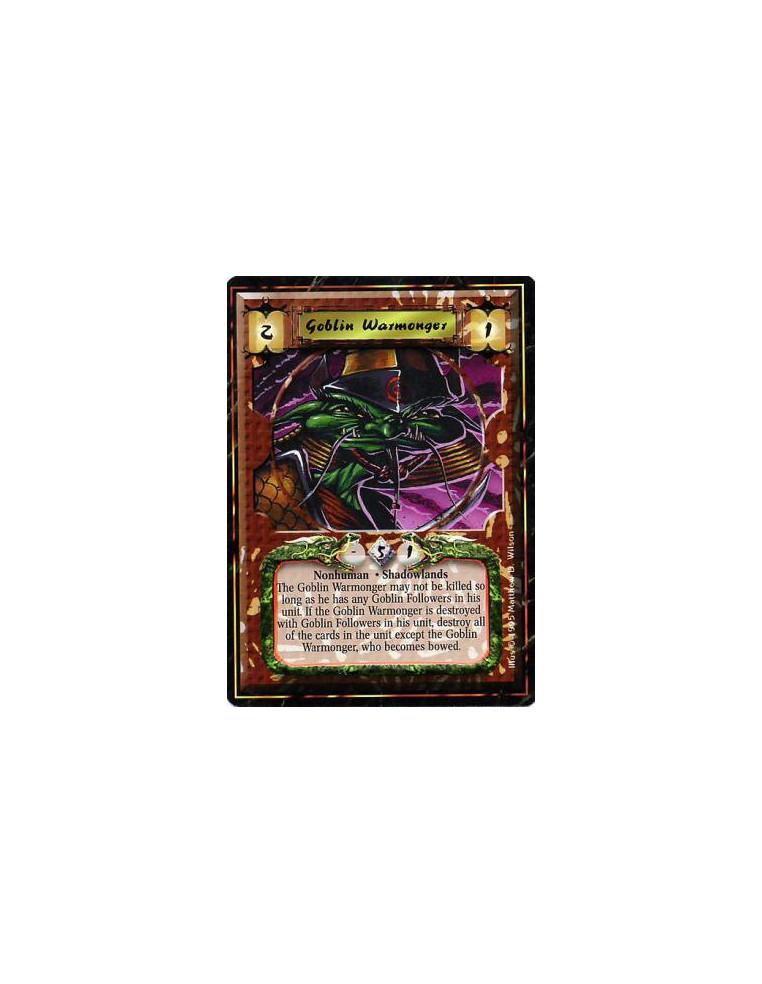 When the Goblin Warmonger would be destroyed, if he has any Goblin Followers, instead destroy all cards in this unit except the Goblin Warmonger and bow the Goblin Warmonger