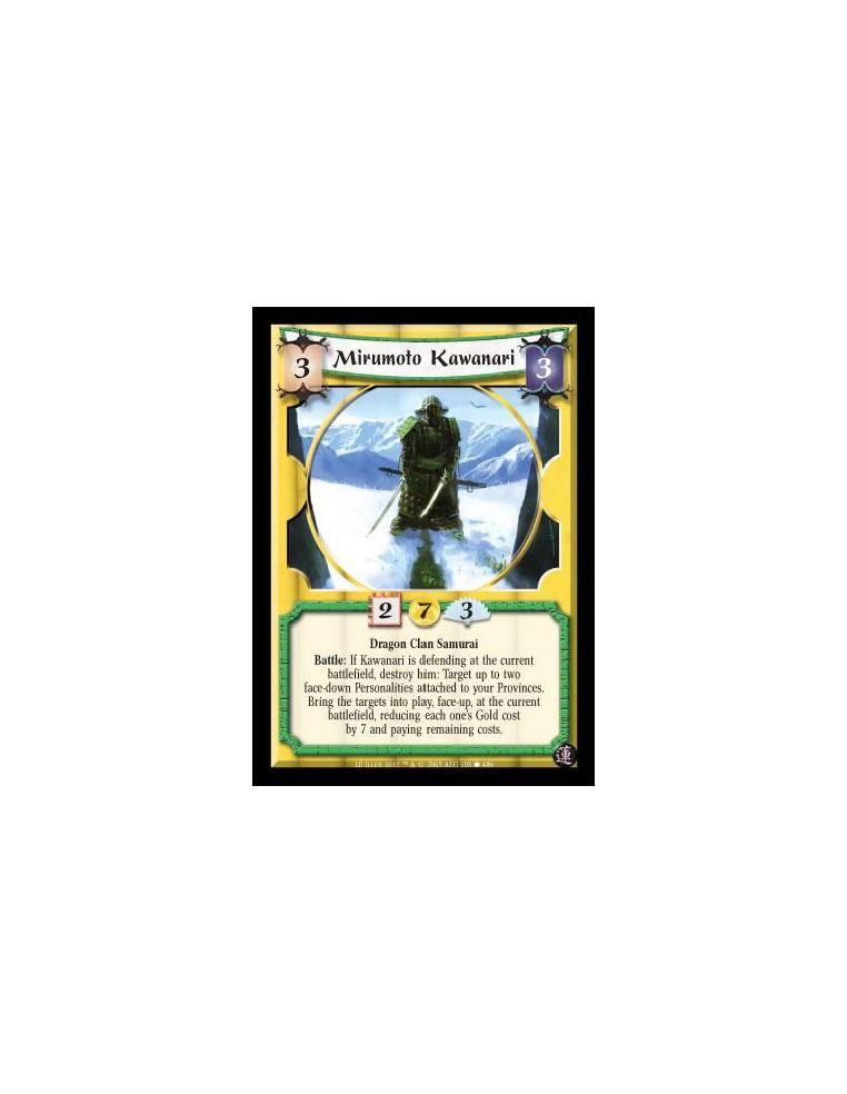 Dragon Clan Samurai. Battle: If Kawanari is defending the current Province, destroy him: Target up to two face-down Personalities attached to your Provinces. Bring the targets into play, face-up, at the current battlefield, reducing each one's Gold cost by 7 and paying remaining costs.
