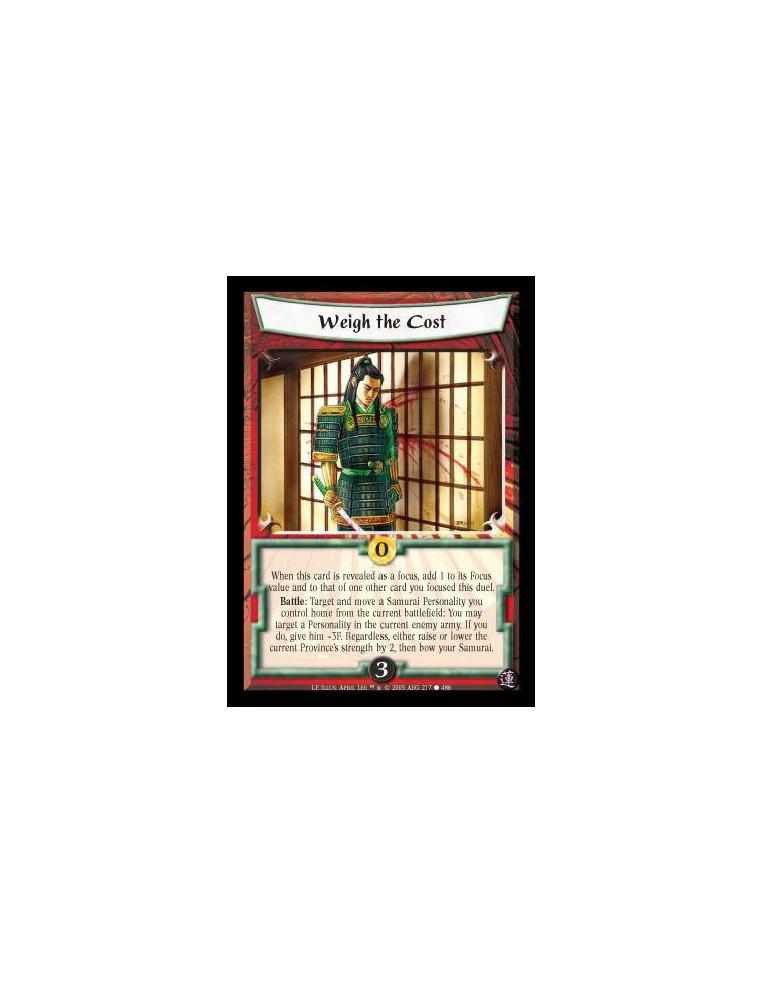 When this card is revealed as a focus in a duel, add 1 to its Focus value and to that of one other card you focused this duel. Battle: Target and move a Samurai Personality you control home from the current battlefield: You may target a Personality in the current enemy army. If you do, give him ?3F. Regardless, either raise or lower the current Province's strength by 2, then bow your Samurai