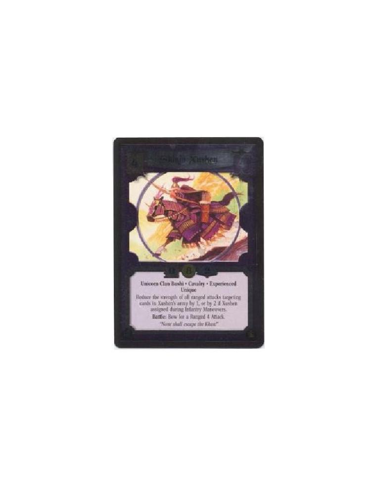 Unicorn Clan Bushi * Cavalry * Experienced * Unique Reduce the strength of all ranged attacks targeting cards in Xushen's army by 1, or by 2 if Xushen assigned during Infantry Maneuvers. Battle: Bow for a Ranged 4 Attack.