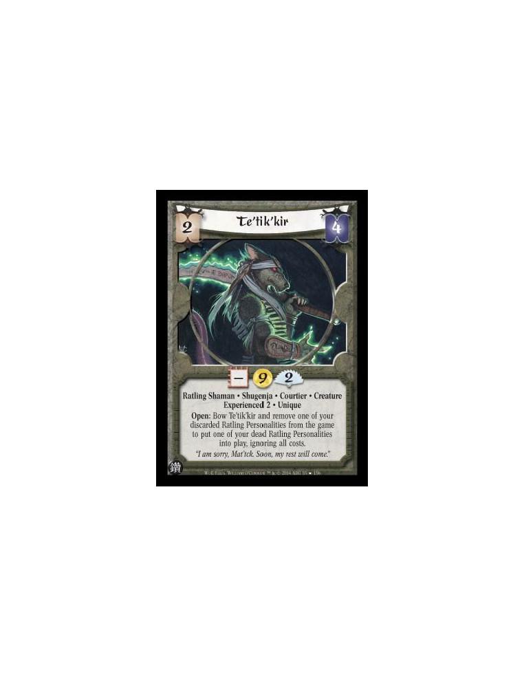 Ratling Shaman. Shugenja. Courtier. Creature. Experienced 2. Unique Open: Bow Te'tk'kir and remove one of your discarded Ratling Personalities from the game to put one of your dead Ratling Personalities into play, ignoring all costs.