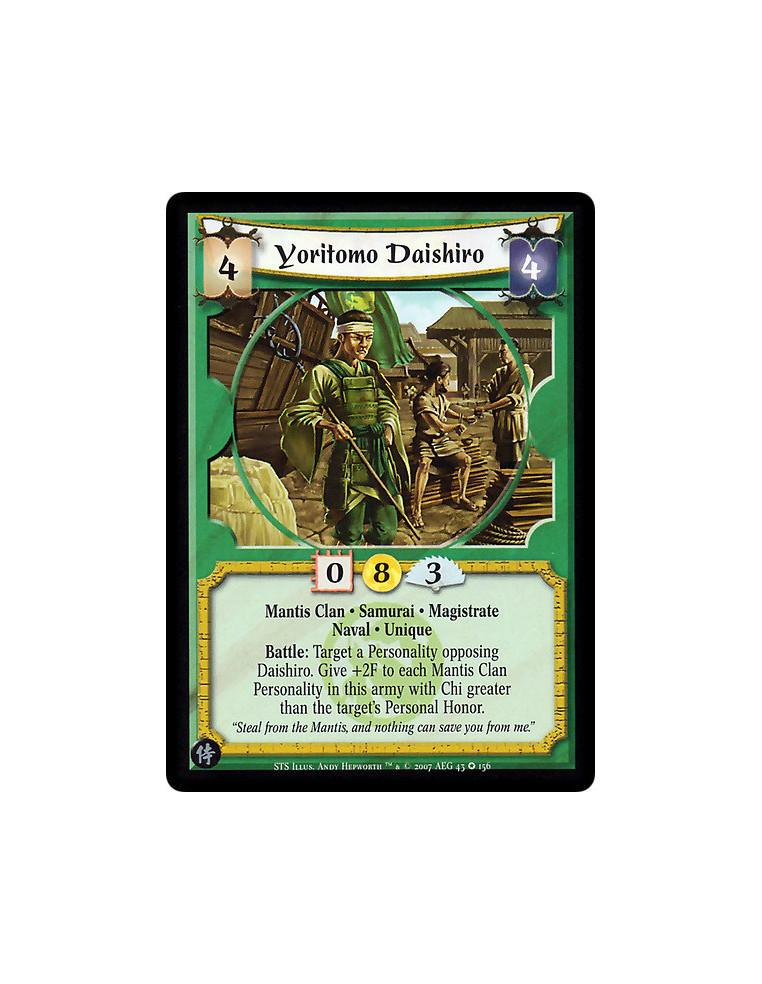 Yoritomo Daishiro (Spanish)  - Mantis Clan · Samurai · Magistrate · Naval · Unique. Battle: Target a Personality opposing Daishi