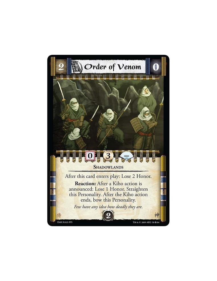 Order of Venom  - Shadowlands After this card enters play: Lose 2 Honor. Reaction: After a Kiho action is announced: Lose 1 Hono