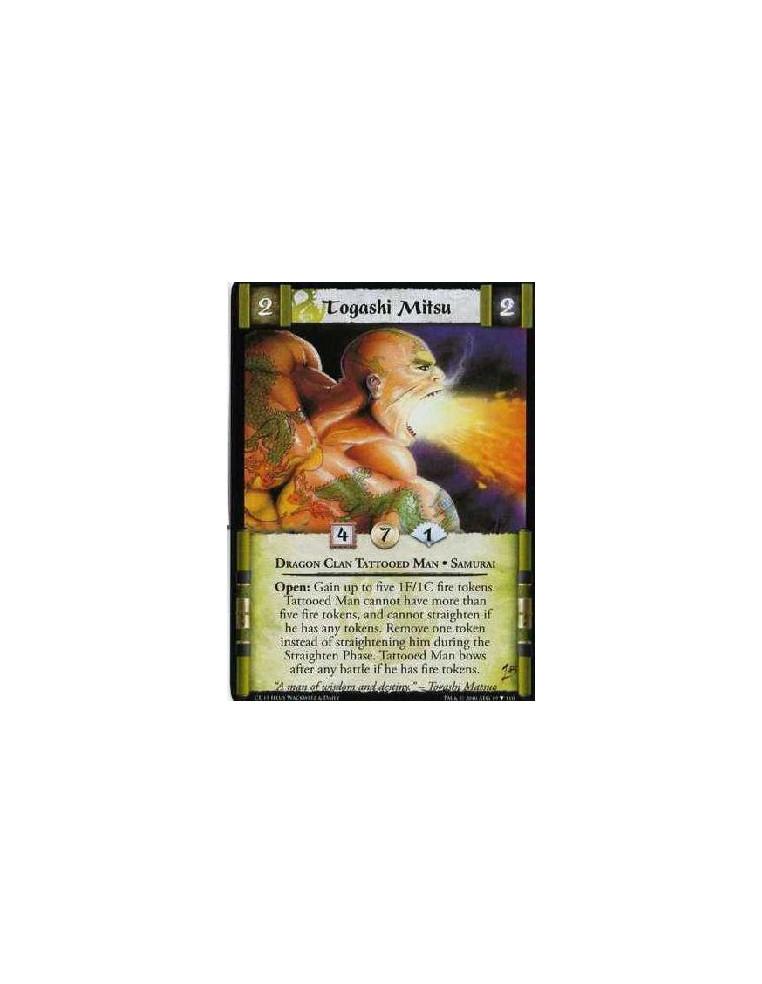 Togashi Mitsu (Spanish)  - Dragon Clan Tattooed Man. Samurai Open: Gain up to five 1F/1C Fire tokens.Tattoed Man cannot have mor