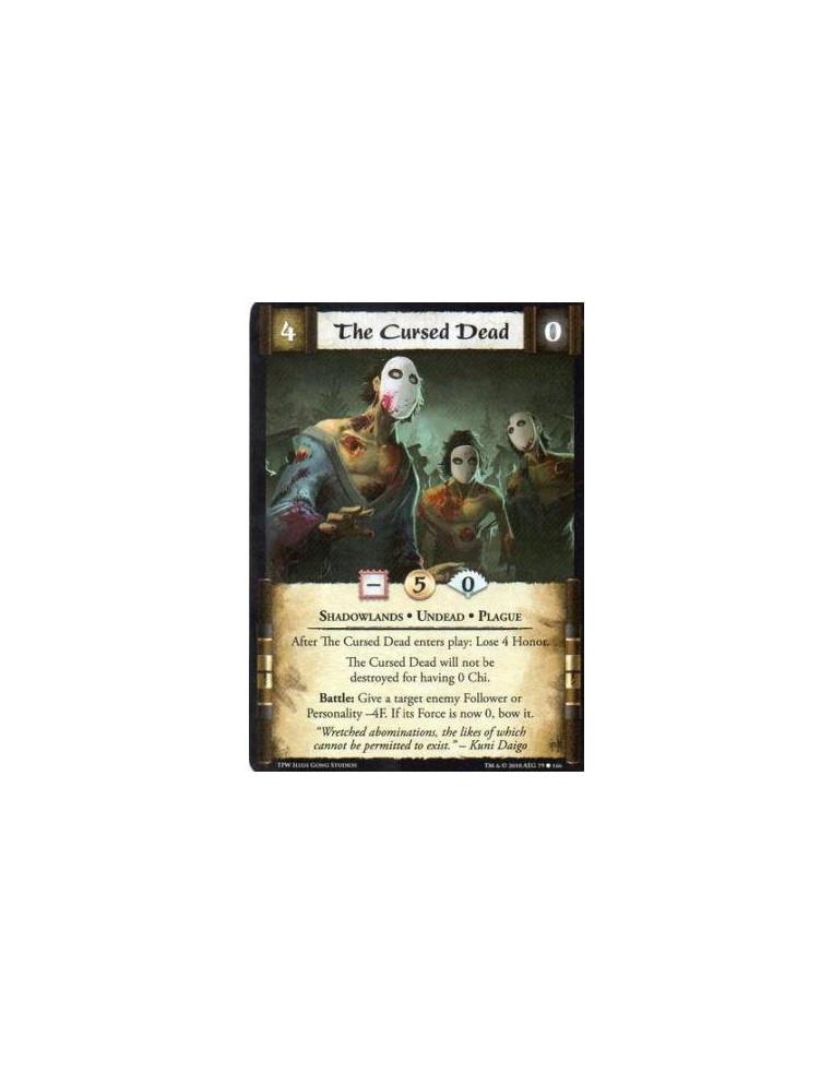 Shadowlands • Undead • Plague After The Cursed Dead enters play: Lose 4 Honor. The Cursed Dead will not be destroyed for having 0 Chi. Battle: Give a target enemy Follower or Personality -4F. If its Force is now 0, bow it.