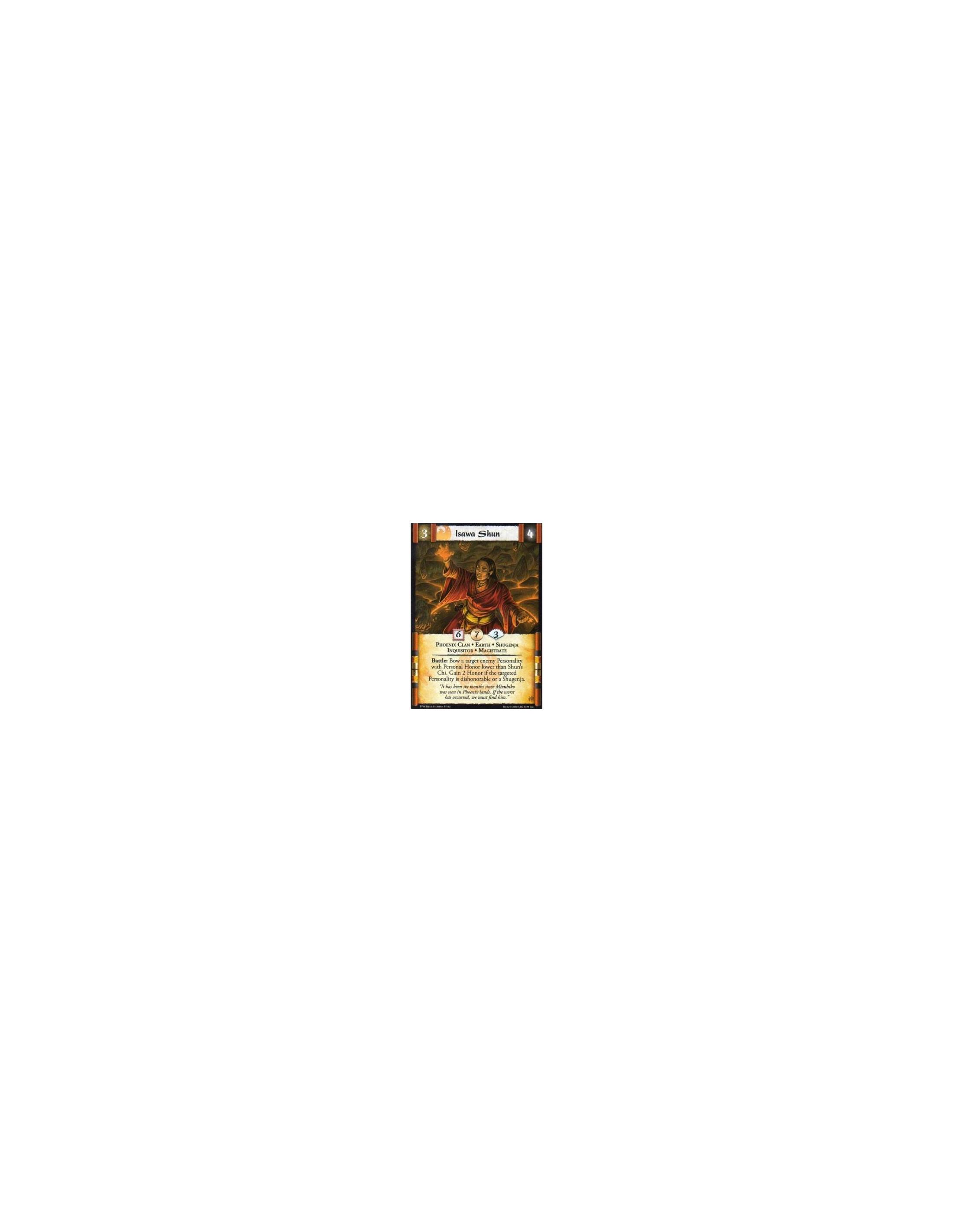 Isawa Shun  - Phoenix Clan • Earth • Shugenja • Inquisitor • Magistrate Battle: Bow a target enemy Personality with Personal Hon