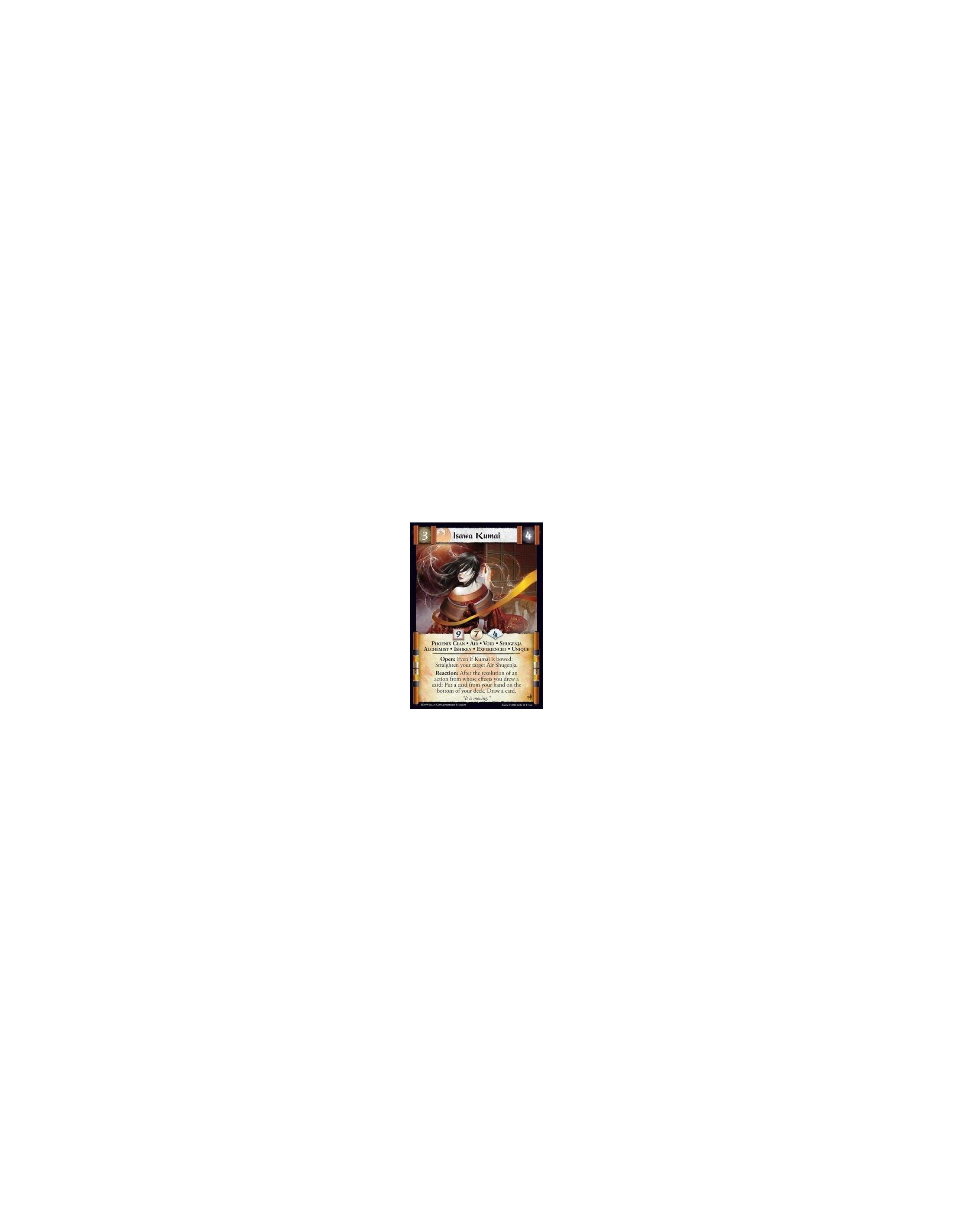 Phoenix Clan • Air • Void • Shugenja • Alchemist • Ishiken • Experienced • Unique Open: Even if Kumai is bowed: Straighten your target Air Shugenja. Reaction: After the resolution of an action from whose effects you drew a card: Put a card from your hand on the bottom of your deck. Draw a card.