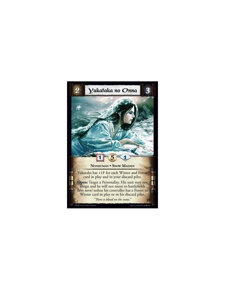 Nonhuman • Snow Maiden Yukataka has +1F for each Winter and Forest card in play and in your discard piles. Open: Target a Personality. His unit may not assign and he will not move to battlefields (this turn) unless his controller has a Forest or Winter card in play or in his discard piles.