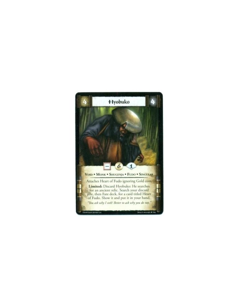 Attaches Heart of Fudo ignoring Gold cost. Limited: Discard Hyobuko: He searches for an ancient relic. Search your discard pile, then Fate deck, for a card titled Heart of Fudo. Show it and put it in your hand.