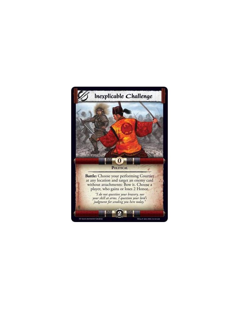 Battle: Choose your performing Courtier at any location and target an enemy card without attachments: Bow it. Choose a player, who gains or loses 2 Honor.