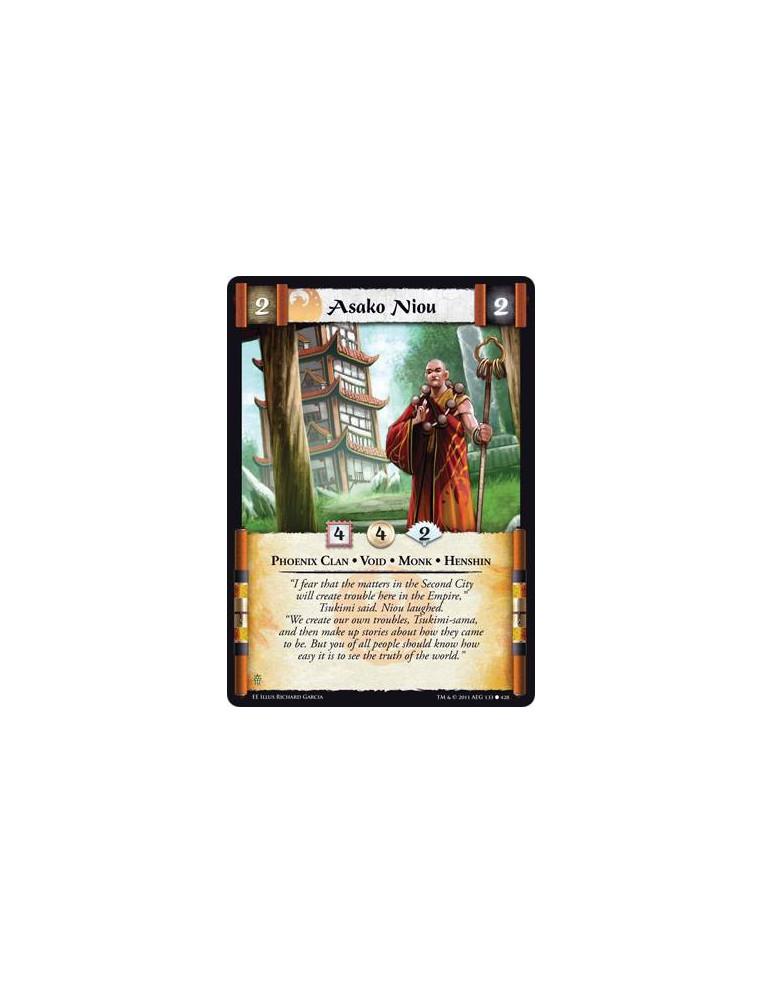 Air • PoliticalWhile this Shugenja is Air, he straightens during each player's Straighten Phase. Open: Bow this Shugenja and target a face-up Personality out of play: Give him +1PH or +1 Gold Cost.