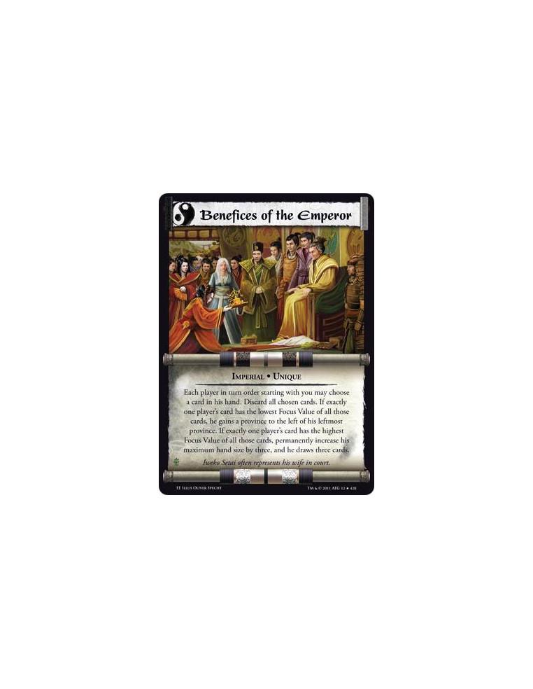 Each player in turn order starting with you may choose a card in his hand. Discard all chosen cards. If exactly one player’s card has the lowest Focus Value of all those cards, he gains a province to the left of his leftmost province. If exactly one player’s card has the highest Focus Value of all those cards, permanently increase his maximum hand size by three, and he draws three cards.
