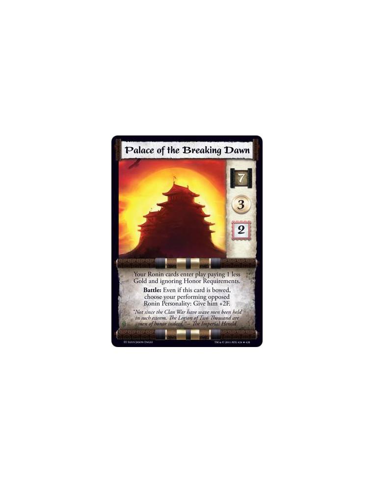 Palace of the Breaking Dawn  - Your Ronin cards enter play paying 1 less Gold and ignoring Honor Requirements. Battle: Even if t