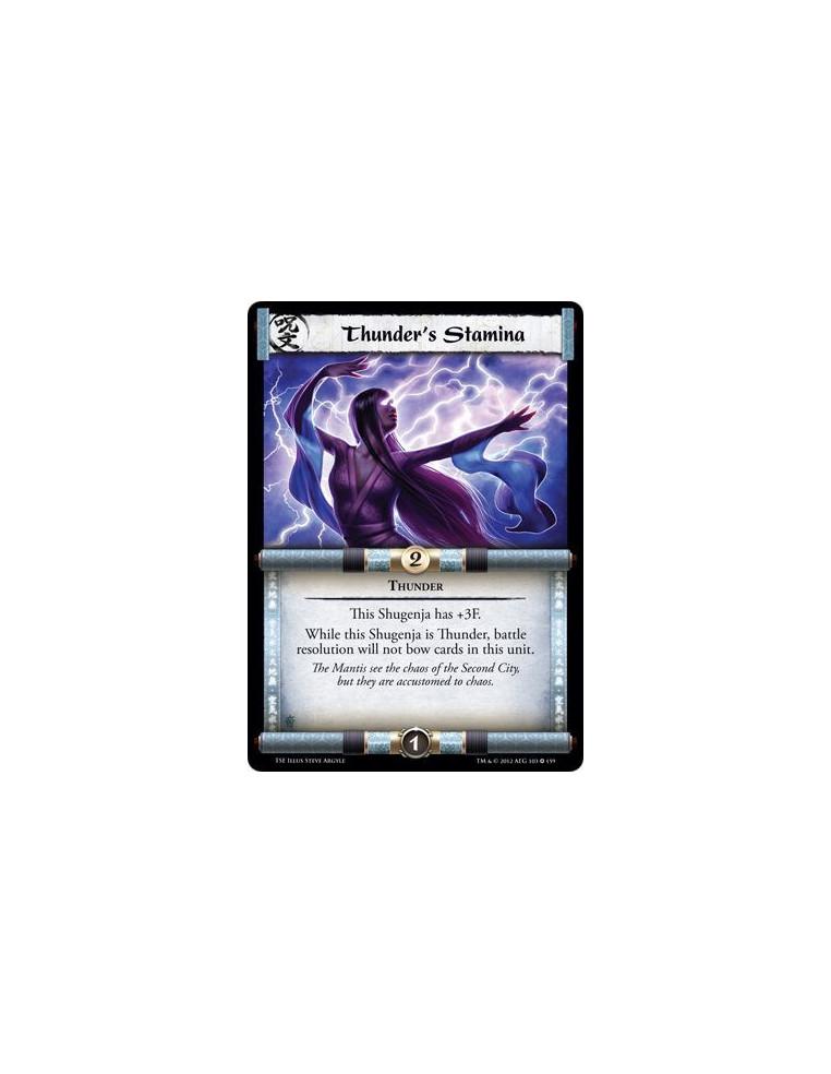 Iaijutsu Focus Effect: After this duel ends, if the duel’s loser did not focus, destroy him. Battle: Choose your performing unbowed Personality: He challenges a target enemy Personality. Bow the duel’s loser’s unit.