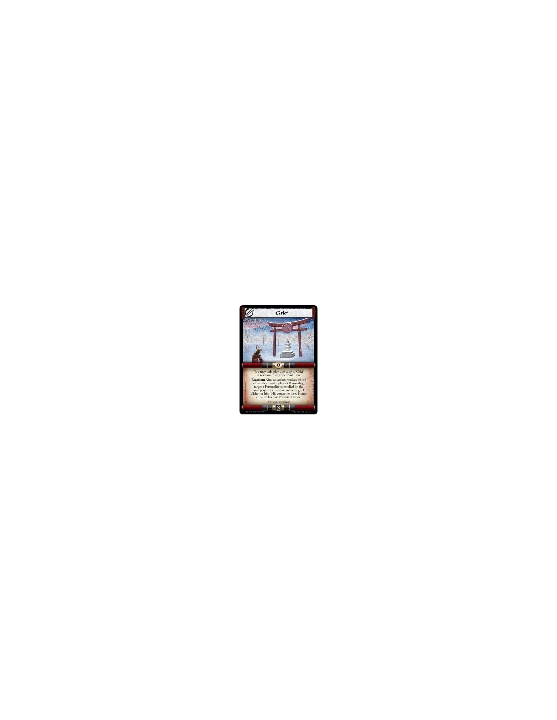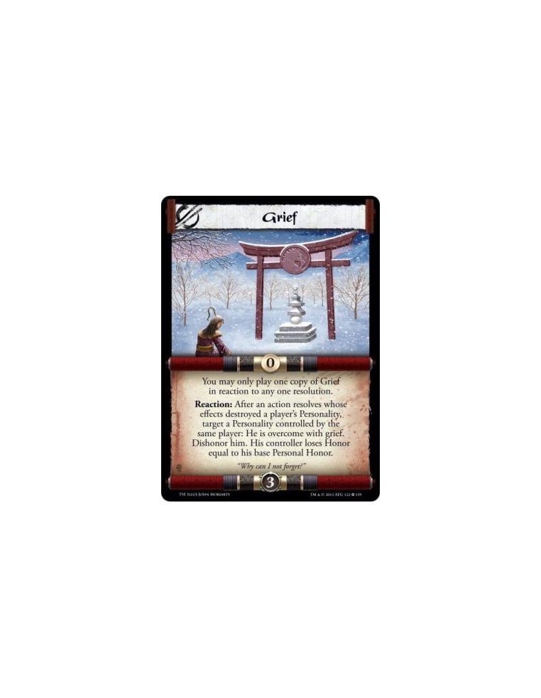 You may only play one copy of Grief in reaction to any one resolution. Reaction: After an action resolves whose effects destroyed a player's Personality, target a Personality controlled by the same player: He is overcome with grief. Dishonor him. His controller loses Honor equal to his base Personal Honor.